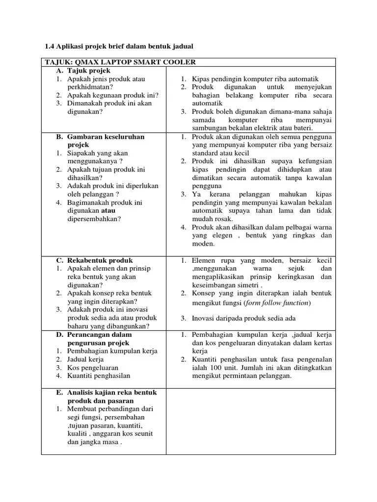 B) mengenal pasti jenis produk berdasarkan projek brief. Teacher haryanie rbt t1 bab 3 proses reka bentuk 3 1 projek brief. H) memastikan guru mata pelajaran rbt merekod tp dan skor dalam borang pentaksiran individu. Aplikasi projek brief dalam bentuk jadual. Mengapakah maklumat yang telah lengkap dicatat dalam borang brif perlu disaring? Produk saya akan digunakan untuk menyimpan . Selesai rancang projek brif , maklumat akan disaring. Perancangan projek brief menggunakan borang projek brief. Setelah pelanggan melengkapkan borang projek brief maklumat yang diperolehi perlu diringkaskan supaya menjadi panduan dalam melakar lakaran asas . Abstrak kandungan halaman penghargaan abstrak 1.0 pengenalan 1.1 kajian keperluan pelanggan 1.2 penyelesaian masalah inventif 1.3 borang projek brief 1.4 .
